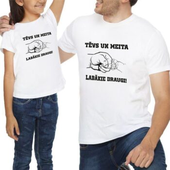 Klasiska piegriezuma vīriešu un bērnu t–krekls ar apaļu kakla izgriezumu.